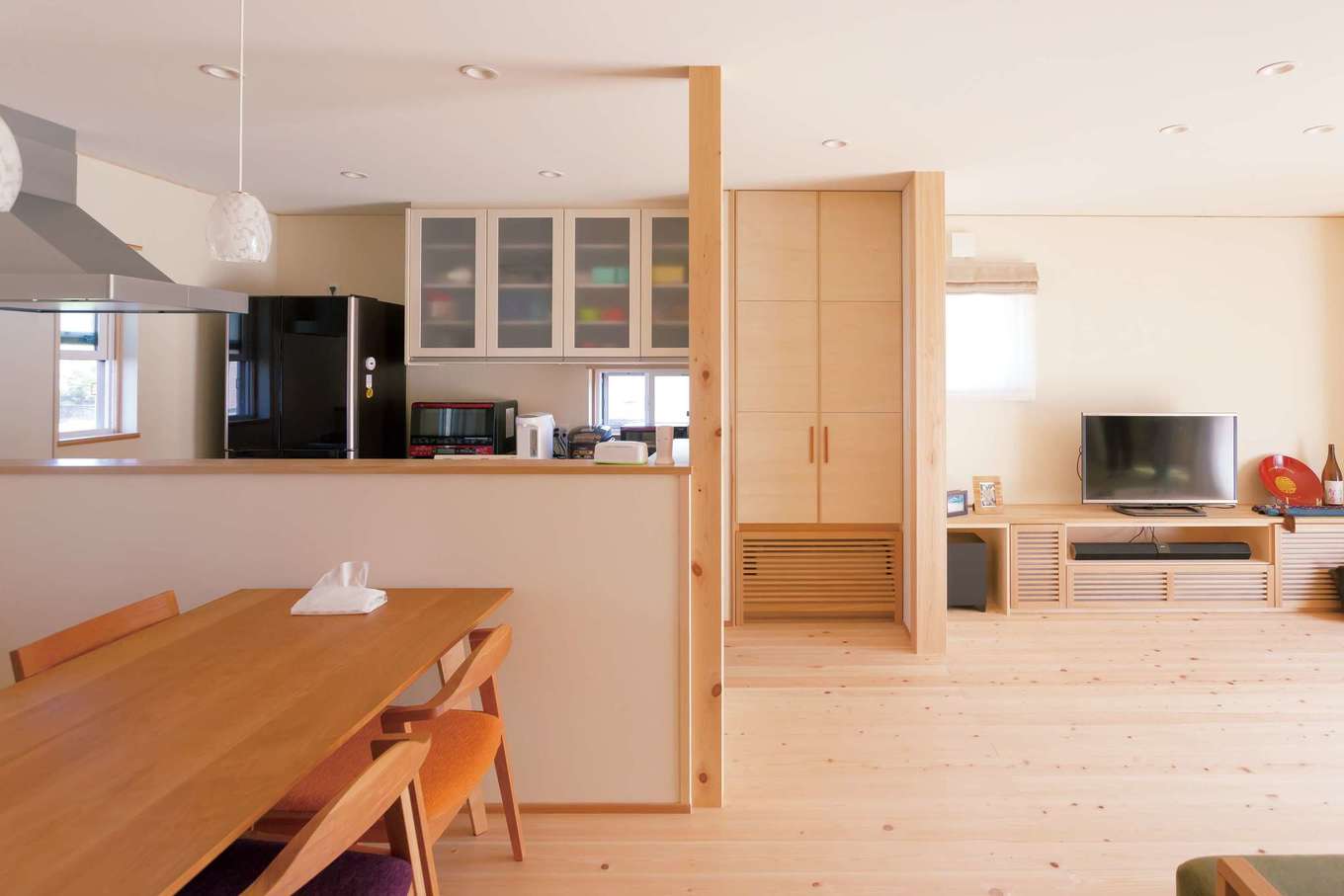 キッチンからフロア全体を見渡せるレイアウト コンロ前の壁をなくして視界を広げつつ 手元が見えないようにカウンターの位置を高めに調整した イエ
