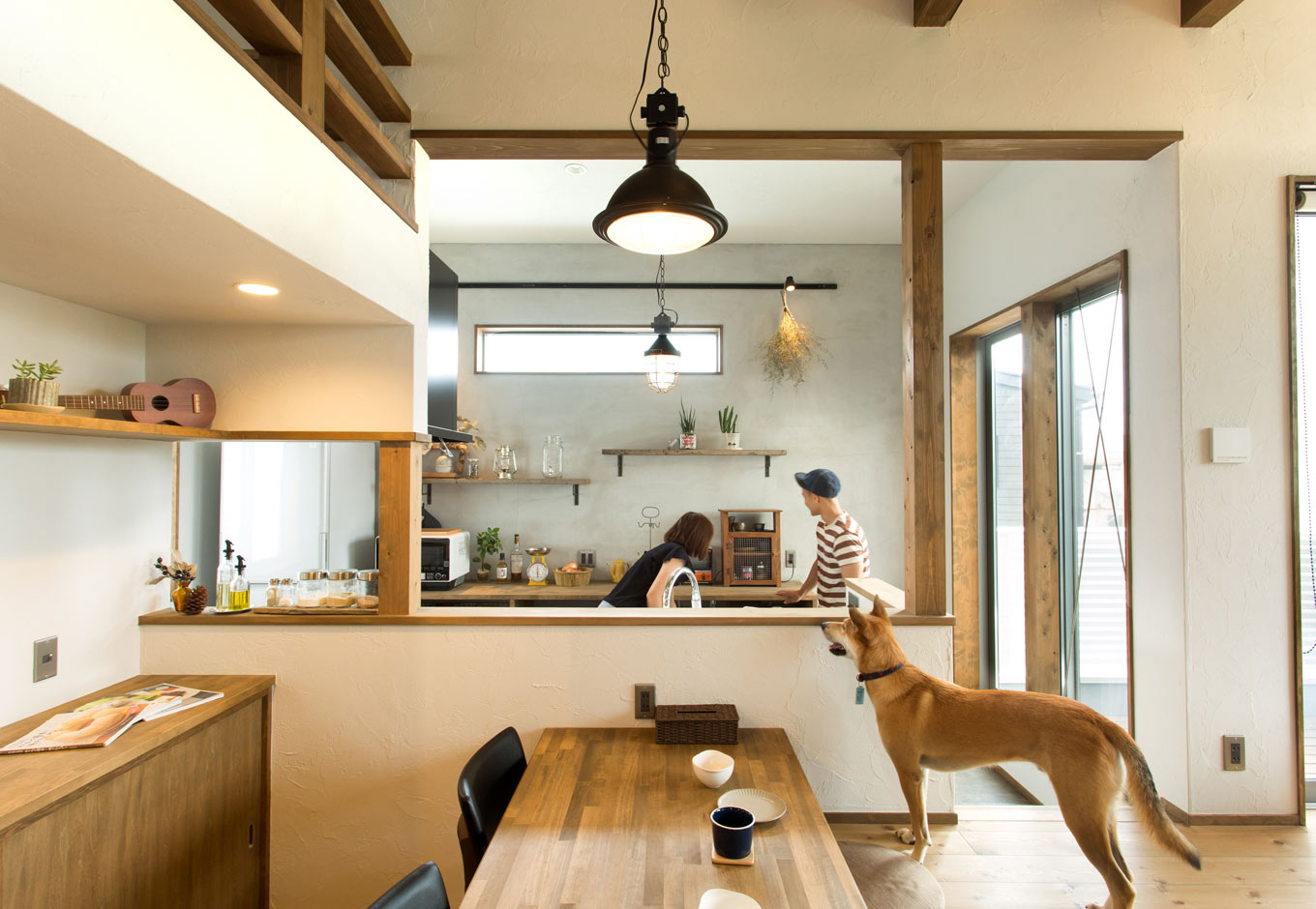 キッチン背面にはモルタル壁をあしらい 古材の飾り棚との相性は抜群
