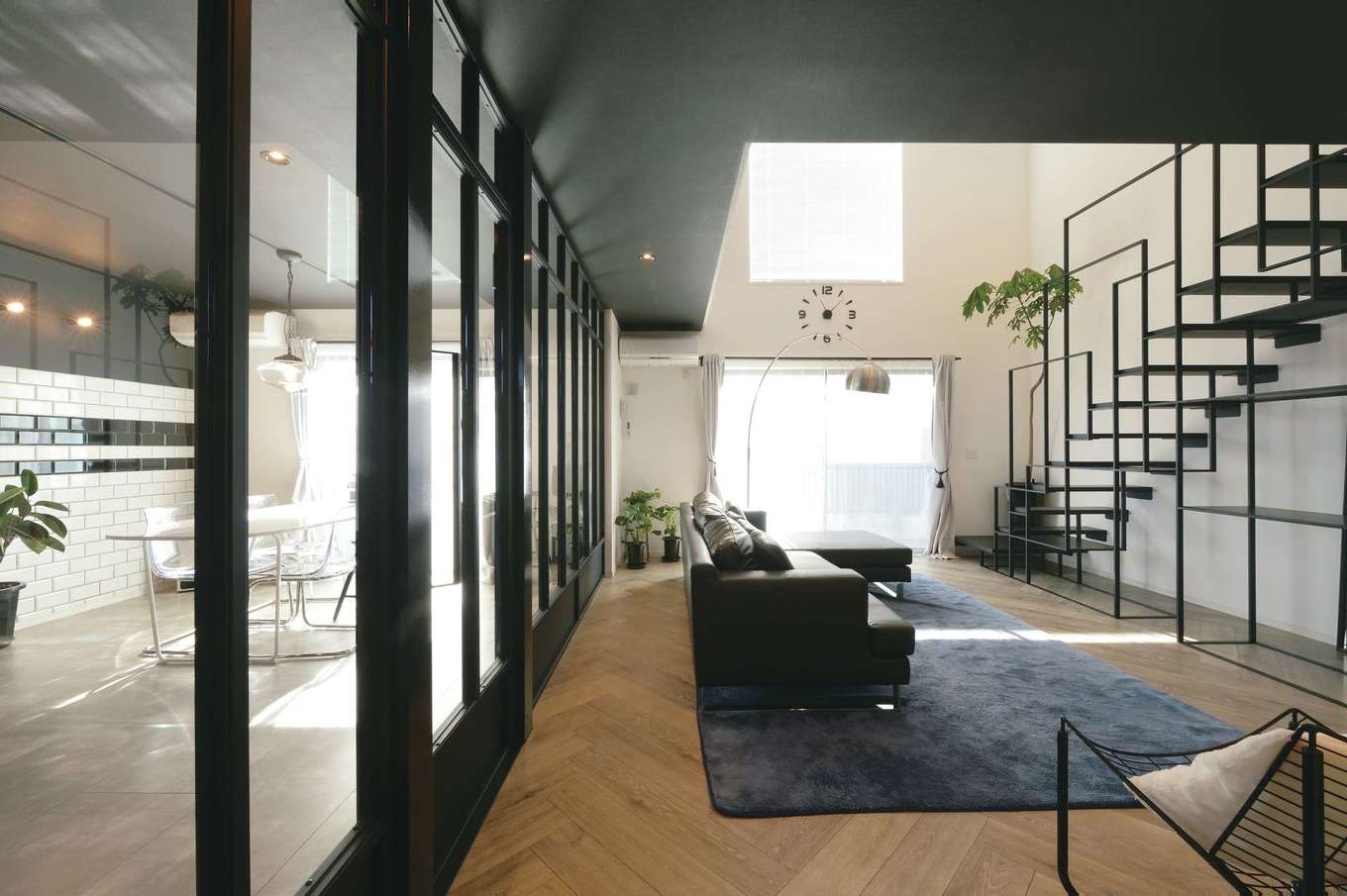 リビングとダイニングキッチンを透明なパーテーションで仕切り 開放感