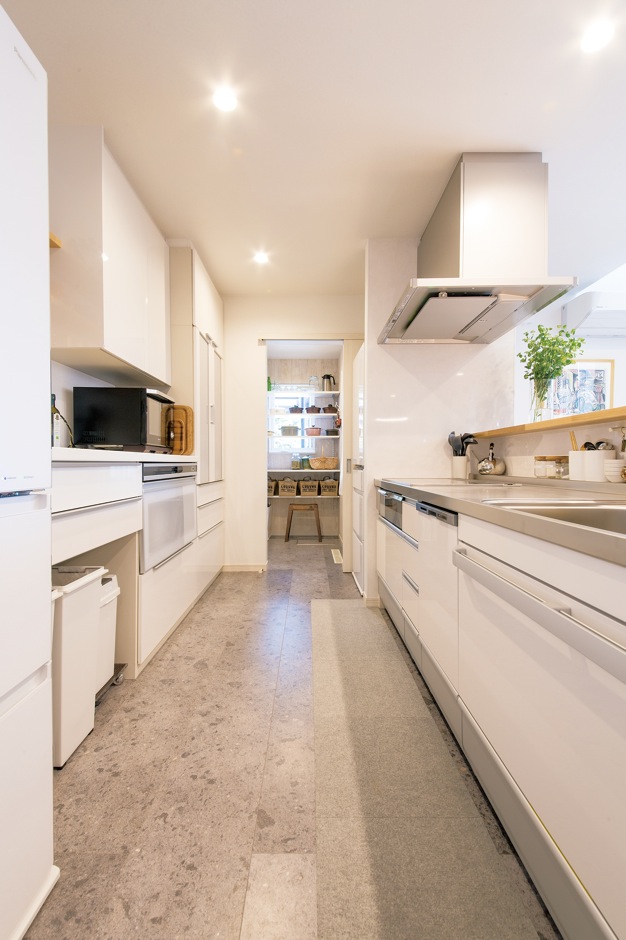 キッチン脇のパントリーは 収納だけでなくワークスペースとしても