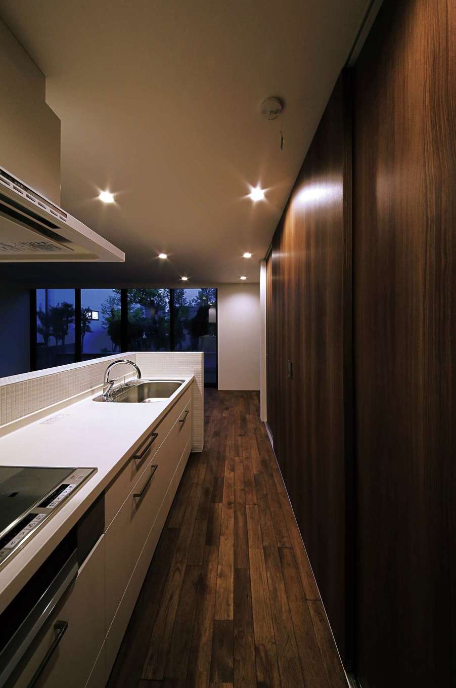 作業性を考えてキッチンの幅は広く 奥には冷蔵庫を隠すためパントリー