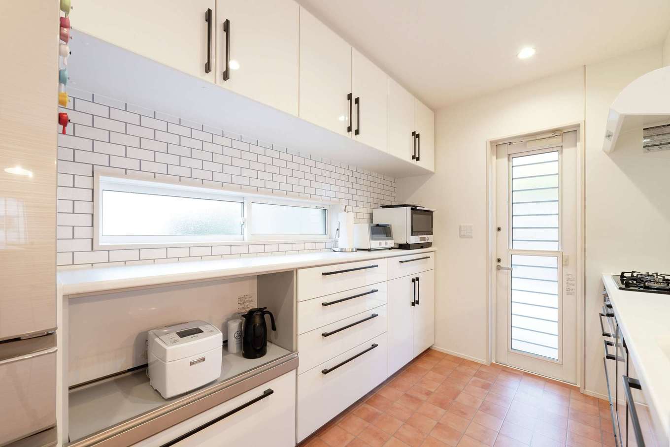 白で統一された明るい北欧風キッチンは 収納力も抜群 背面カウンター