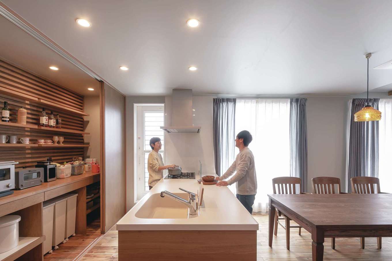 キッチンの背面には大きな扉で電化製品や用品類をすっぽりと 隠す収納