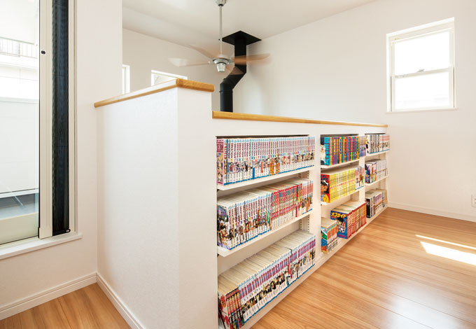 2階の腰壁一面にニッチを設けてコミックを収納 イエタテ