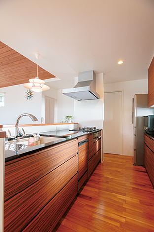 キッチン対面側の腰壁にはオークの羽目板を貼り オーク材の木目 黒が